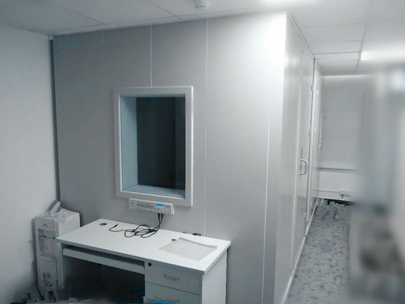 隔聲門:齊平安裝凸輪提升合頁,磁性密封,隔聲門板的內外棉使用冷軋鋼板制造,門側、門頂與門框裝有兩套詞性壓縮密封帶,當門處于關閉位置時形成隔聲環(huán)。門板底部是在門關閉時能使門緊壓地板的重力作用密封條,不采用門檻式密封。隔音窗為具有壓力密封的鋁型材窗框結構,使用雙層夾膠安全玻璃窗。接線系統(tǒng)、照明系統(tǒng)、通風系統(tǒng)都會按照客戶要求而配置。