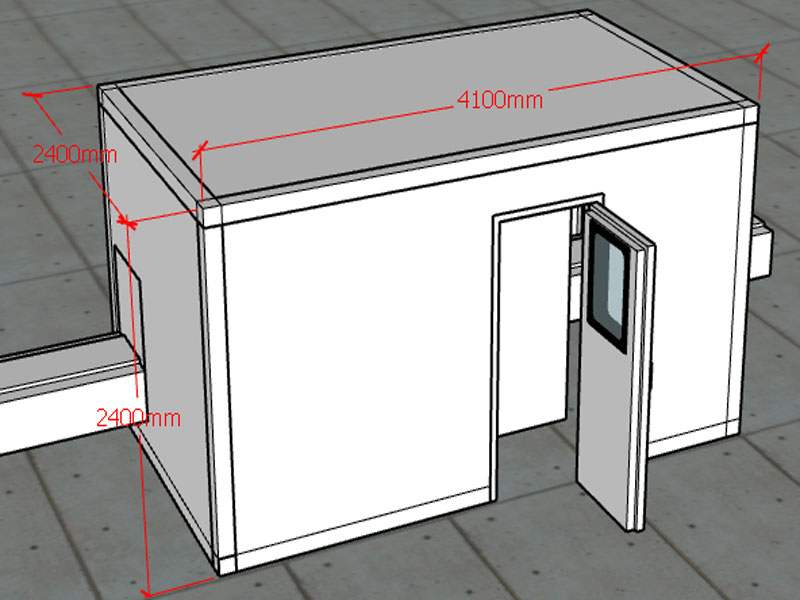 1.1.1根據(jù)我司技術(shù)人員現(xiàn)場測量,流水線處環(huán)境噪聲為75-78dB(A),設(shè)計(jì)隔音房尺寸為:2400mm*4100mm*2400mm。隔音房板厚120mm,預(yù)計(jì)隔音房安裝完成后,內(nèi)部噪聲值降至40dB(A)。